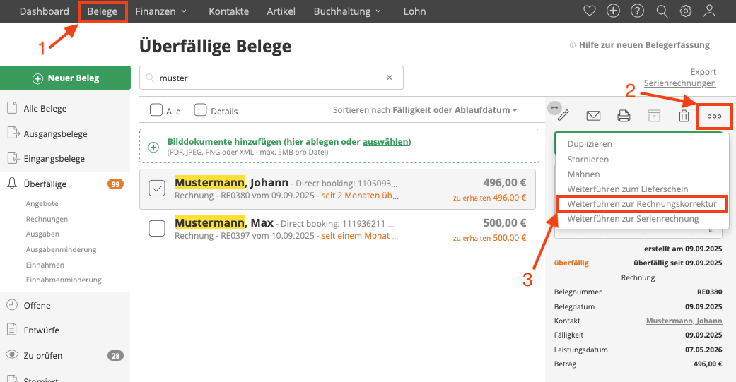 Dafür klickst du im Reiter „Belege“ auf die ursprünglich in Lexware Office angelegte Rechnung für die Buchung und danach auf die drei Punkte und auf „Weiterführen zur Rechnungskorrektur“.